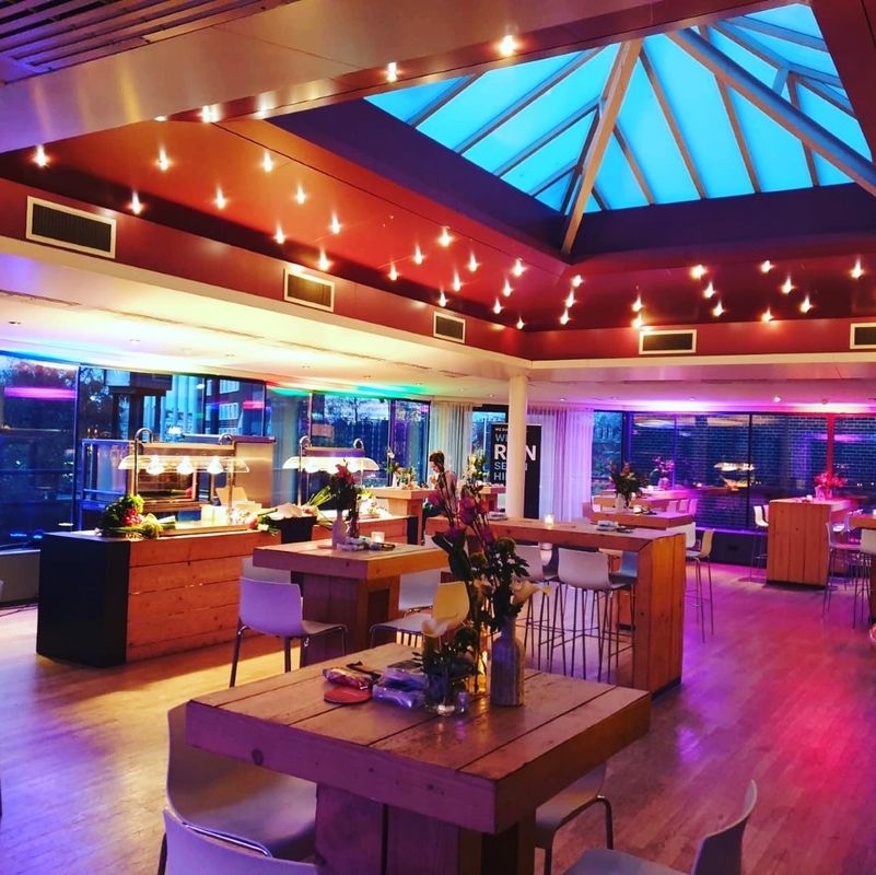 Boven het restaurant is op het dak tussen de torens een foyer geplaatst, die een prachtig panorama biedt over het Keizer Karelplein.