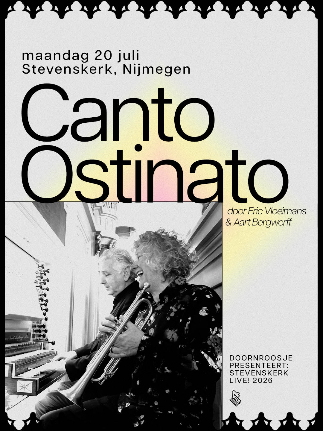 In deze uitvoering brengen trompettist Eric Vloeimans en organist Aart Bergwerff het stuk van Ten Holt op een geheel nieuwe manier tot leven. Eric een van Nederlands meest geliefde trompettisten staat bekend om zijn warme toon en expressieve improvisaties terwijl Aart met zijn rijke ruimtelijke orgelklank een diepe dimensie toevoegt. Samen ontstaat een bijzondere dialoog tussen trompet en orgel die het publiek volledig meeneemt in de hypnotiserende wereld van Canto Ostinato.