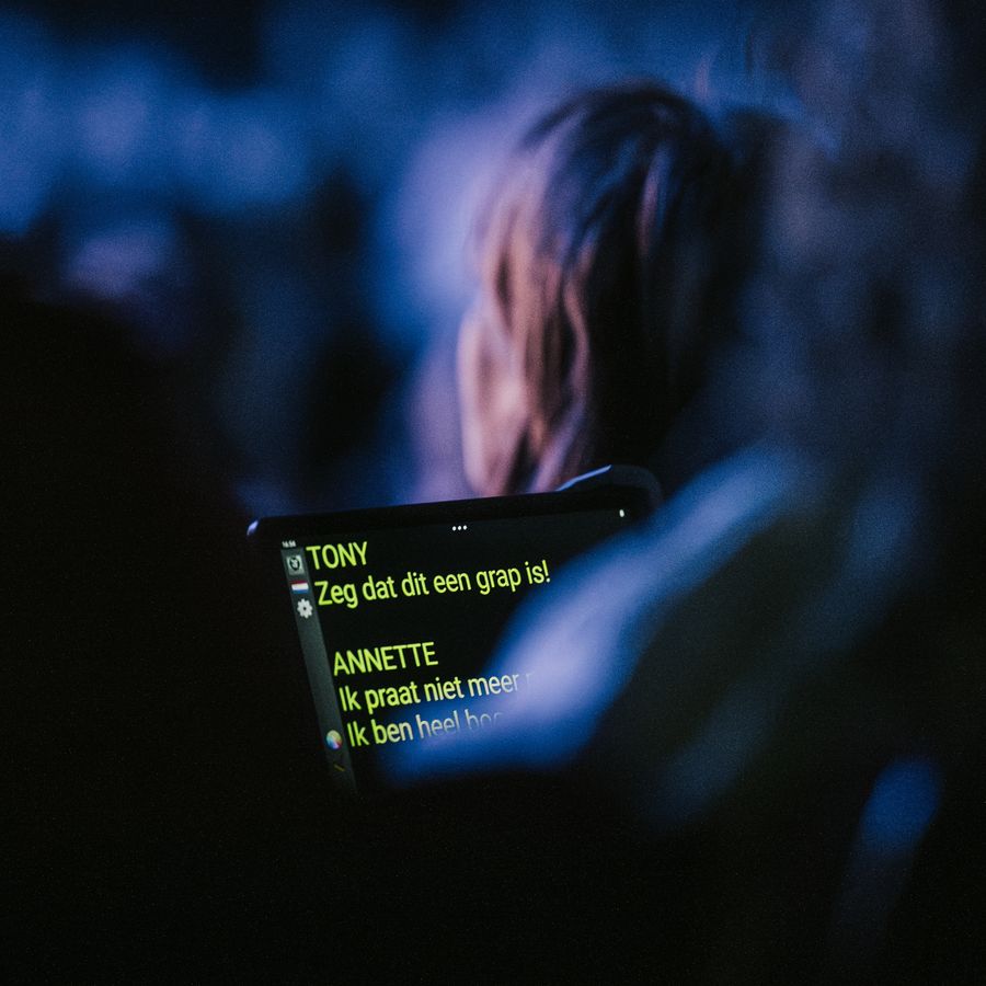 De schrijftolk zorgt ervoor dat je kunt meelezen op een eigen scherm. Hiervoor zijn plaatsen in de zaal gereserveerd.